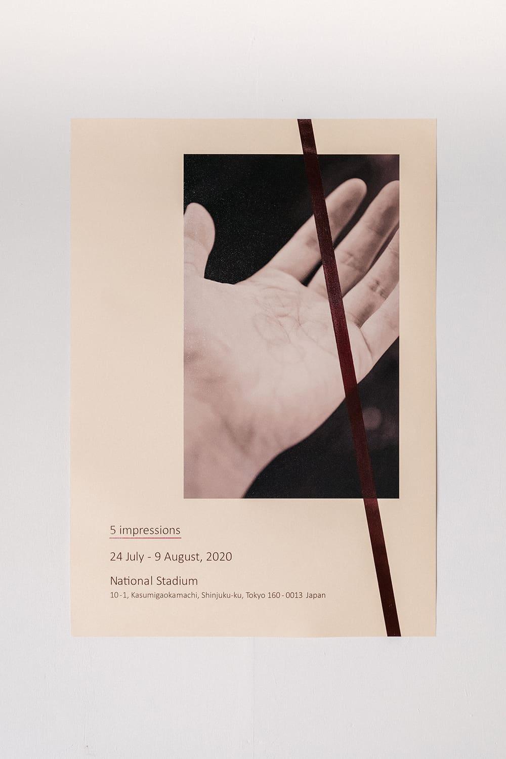 《5つの印象》は、日英2種類のセピアカラーのポスターに、着彩が施された作品。日時や場所などが記されているが、これは当初予定されていた、ある大型イベントの内容と重なる。写真の手のひらには、そのイベントを象徴するかのような5つの丸い跡がついているが、これは5種類の「強い国々」の硬貨を押し当てた跡。表面に描かれたペイントは、もともと手のひらに残る充血の色を抽出している。経済効果ばかりが取り上げられ、人々の怒りや疑問の声があがる現在の状況とも重なるかもしれない。ニスの乗った写真や文字は印刷であるが、強い物質感を持つ。さらに上から重なる絵の具により現在性が強調されている。